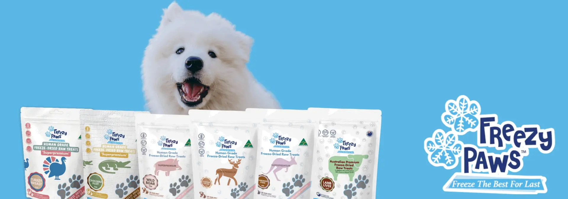 A happy white Samoyed dog smiling in front of a lineup of Freezy Paws freeze-dried raw dog treats, including turkey, crocodile, wild boar, venison, kangaroo, and lamb liver varieties, with the Freezy Paws brand logo displayed on a bright blue background.