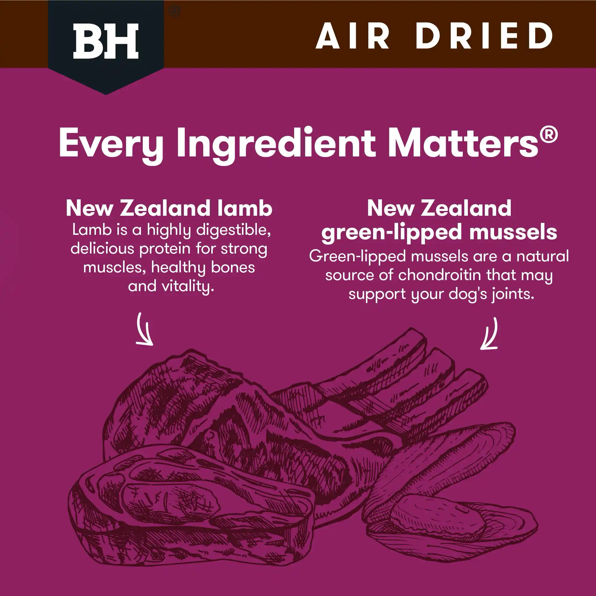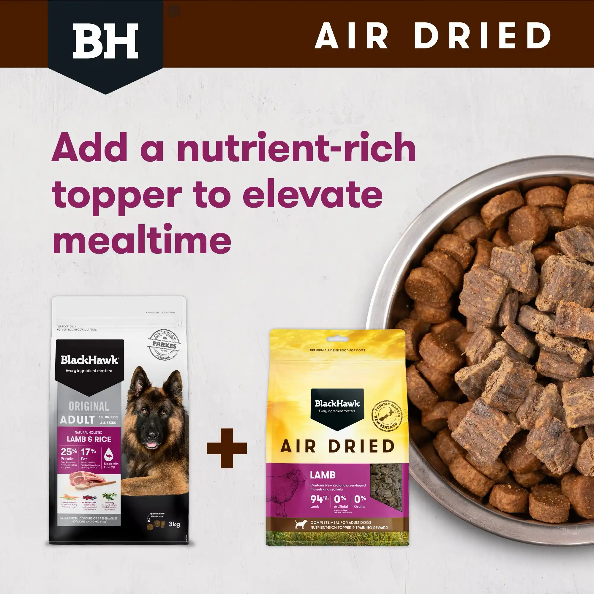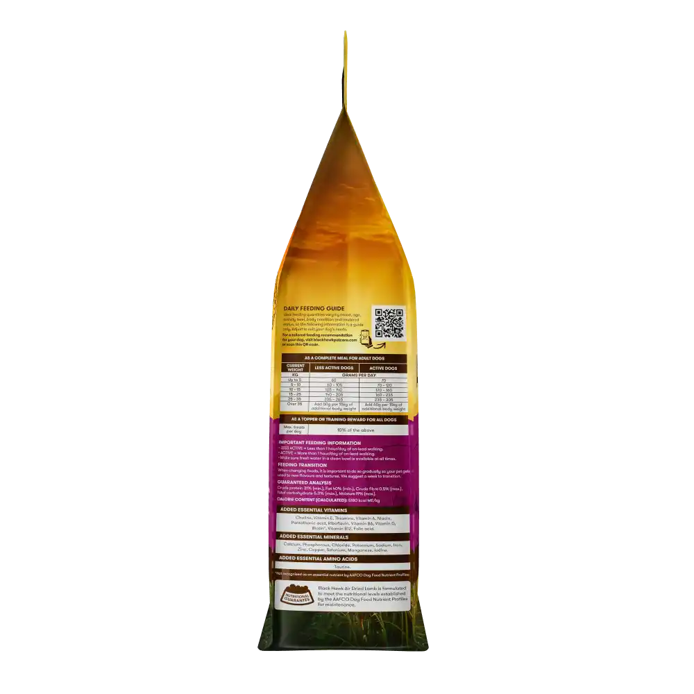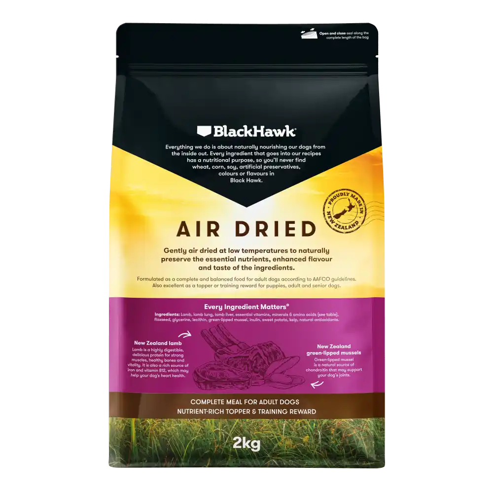 Whether you want to boost mealtime nutrition or feed a full premium diet, Black Hawk Air Dried Lamb is a natural, delicious and nutrient-dense choice for dogs of all breeds.