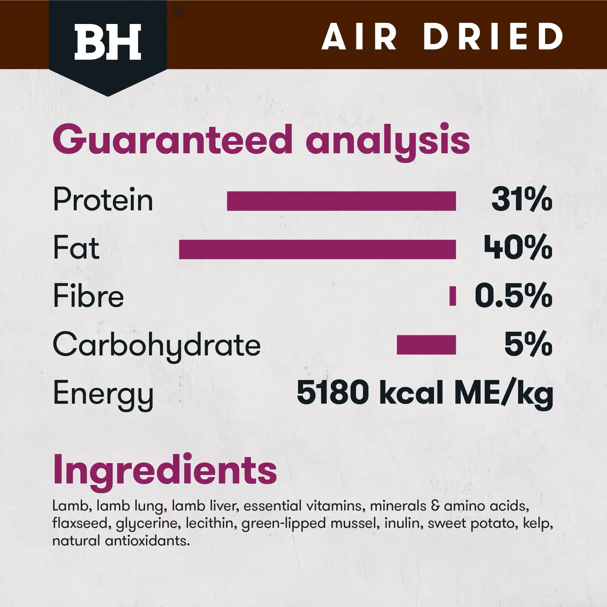 Lamb, lamb lung, lamb liver, essential vitamins, minerals & amino acids, flaxseed, glycerine, lecithin, green-lipped mussel, inulin, sweet potato, kelp, natural antioxidants.