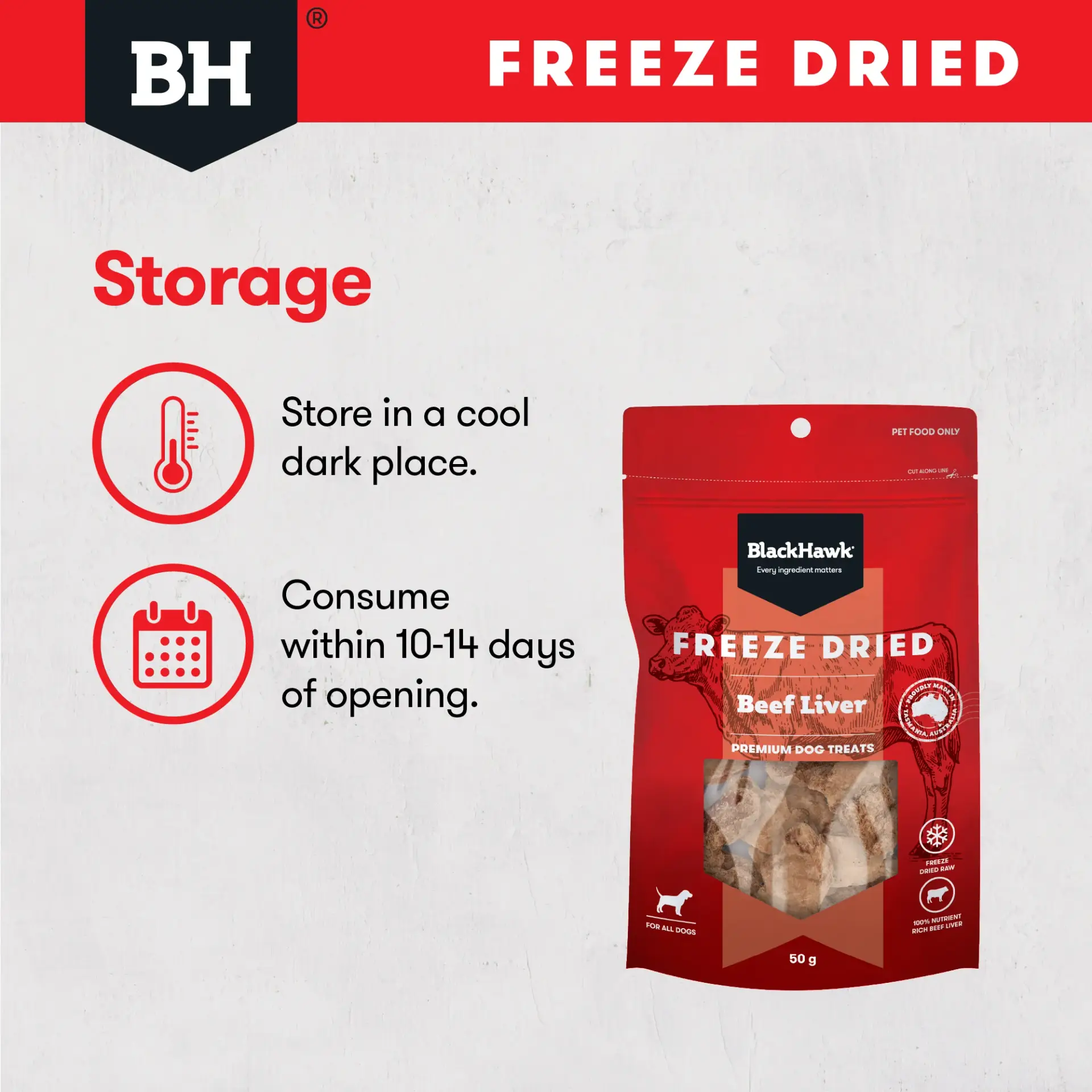 As with everything BlackHawk creates, every ingredient matters. That’s why these freeze dried Black Hawk liver treats are made using carefully selected Australian ingredients and crafted to support a balanced, healthy lifestyle for your dog — even when it’s treat time.