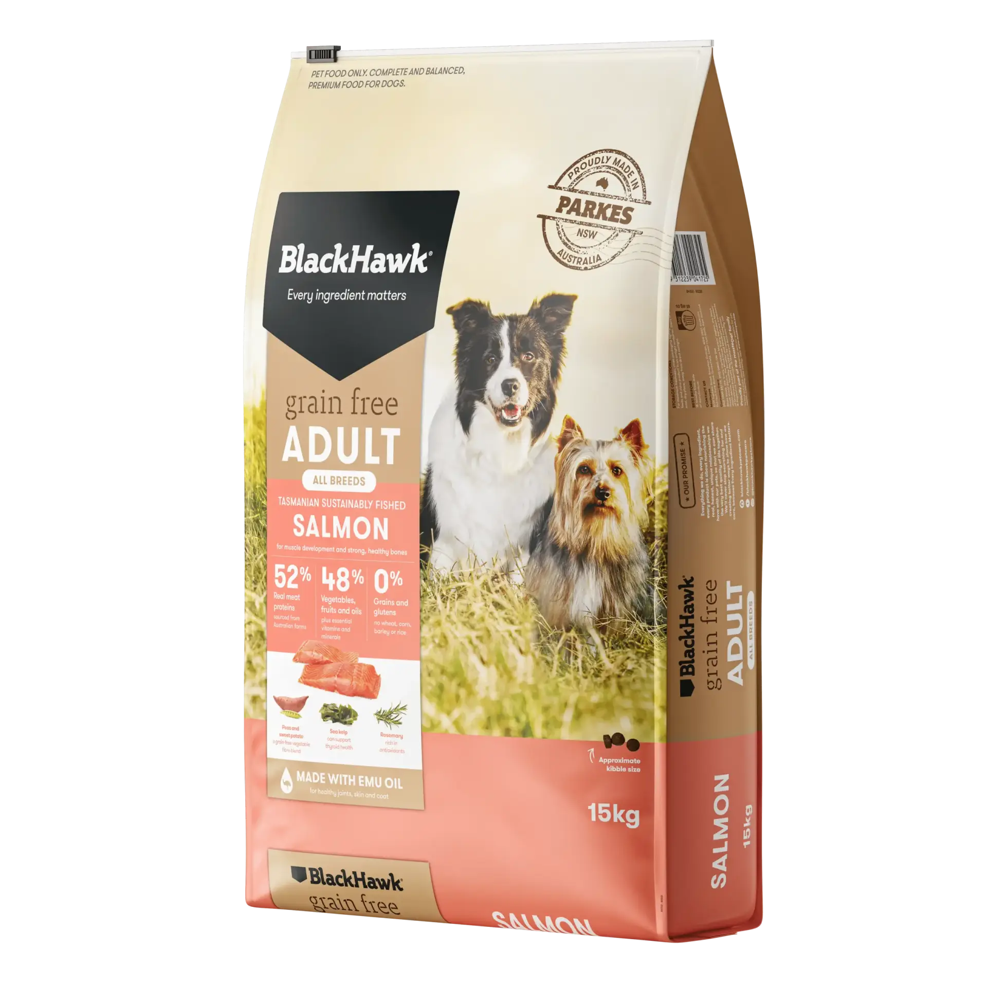 BlackHawk believes every ingredient matters. That’s why this recipe contains no artificial colours, flavours, or preservatives — just real Australian ingredients prepared with care. Proudly made in regional New South Wales, it reflects a commitment to local sourcing, nutritional integrity, and the wellbeing of Aussie dogs.