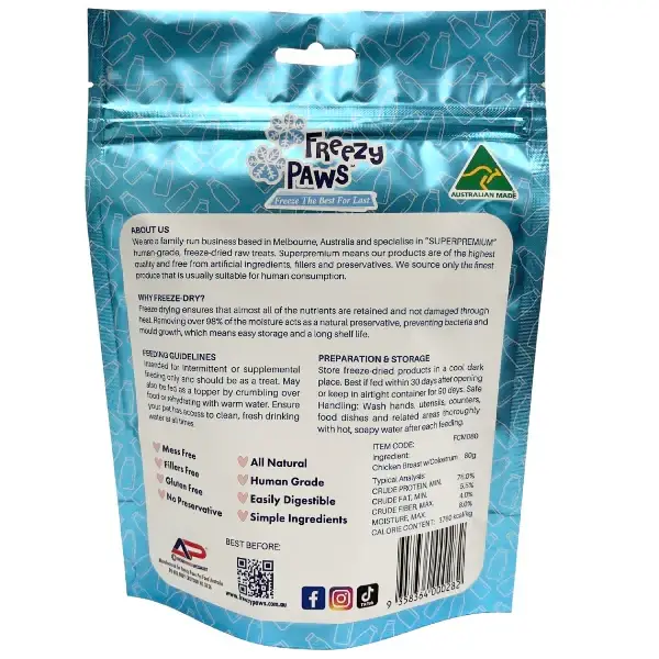 Freezy Paws Freeze Dried Chicken Breast with Colostrum Treats are incredibly versatile. Use them as a high-value training reward, break them into smaller pieces for portion control, or crumble them over meals to boost flavour and functional nutrition. Their natural aroma and mild taste make them appealing even to fussy eaters.