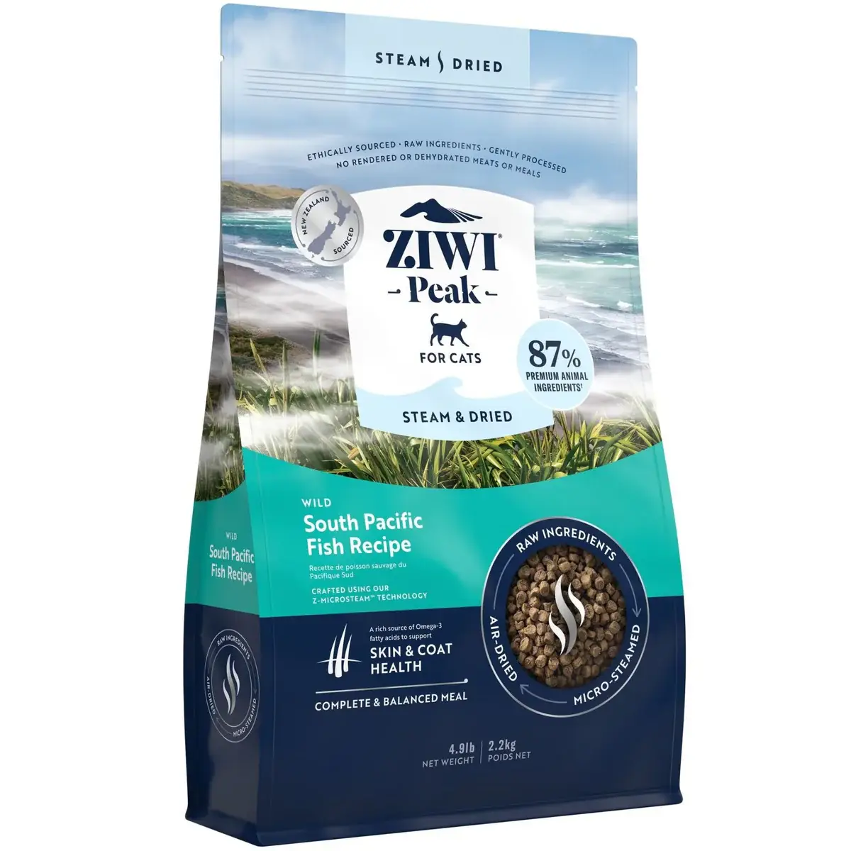 ZIWI Peak Steam & Dried South Pacific Fish Dry Cat Food delivers the goodness of wild-caught fish from the pristine waters of the South Pacific, using ZIWI Peak’s innovative Z-MicroSteam™ technology. Made with 87% premium animal ingredients, this complete and balanced dry cat food offers raw-inspired nutrition with the convenience of a shelf-stable, easy-to-serve meal.
