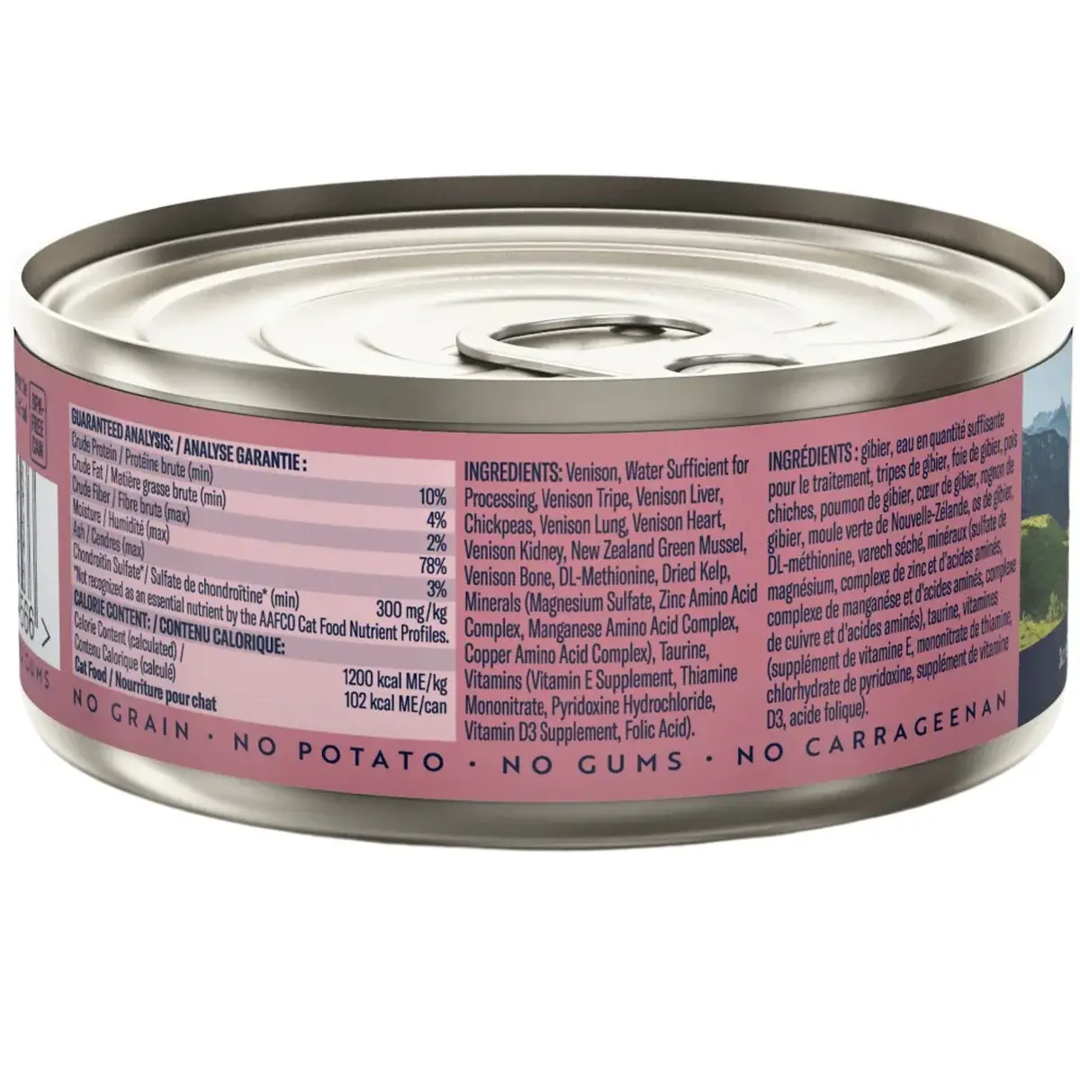 Primary Ingredients: Venison, water sufficient for processing, venison tripe, venison liver, chickpeas, venison lung, venison heart, venison kidney, New Zealand green mussel, venison bone, DL-methionine, dried kelp, minerals, taurine, vitamins.